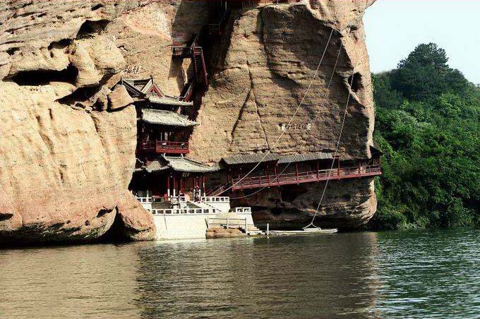 水巖在旱仙巖北面,靠上清河兩岸,因臨水而名,以碧水丹山而聞名遐邇,主體在西岸。要主景點(diǎn)有古棧道遺址、飛云閣、棋盤石、“仙女獻(xiàn)花”、仙梳石、金鐘峰、仙勺石、雌雄石等。怪石奇巖,滿山紛陳,隨處是景,目不暇接。從龍虎山莊附近乘船行不遠(yuǎn),對(duì)岸即是水巖,只見崖壁貼岸,陡立如屏,古樹橫生,藤蔓垂掛,山崖上古棧道遺址依然存在。在崖壁上有許多名人題刻,如“玉壁凌空”、“半天仙跡”、“神仙可接”等。至一峽口上岸,左側(cè)即絕壁獨(dú)立的“仙女獻(xiàn)花”。沿山徑上山,一路美景不斷。對(duì)岸亦是高峰聳立河邊,上清河蜿蜒中間,青山碧水,幽景迷人。