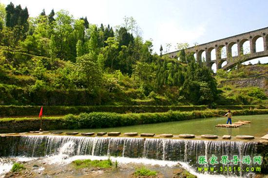 寨前阡陌縱橫,溪流交錯(cuò),九曲迂回,水邊是排排水車、石碾,水里是整塊整塊的天然青巖板,出水為洲,入水為瀑,并形成許多奇特階梯瀑,水上是一道道巖板堰,堰上是一道道形態(tài)各異的跳巖,水溝上橫著塊塊巨大的巖板橋……山水田園與水車、水碾、巖板堰、巖板橋、跳巖相互輝映,構(gòu)成一幅幅絕妙畫(huà)卷。
