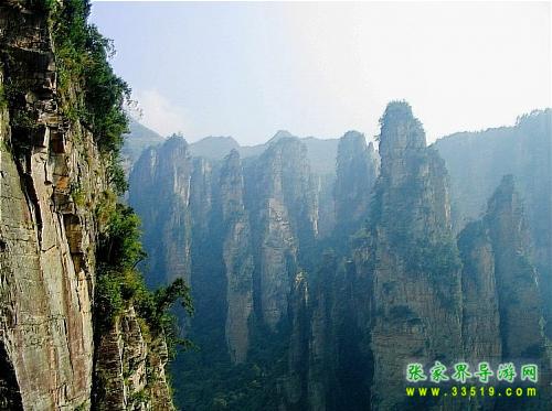 臺東五米處,一懸?guī)r突兀橫伸,下嵌深谷,曰“拜仙臺”。憑欄環(huán)顧,鷂子寨、羊寨、黑樅垴猶如翠屏,依天并列。臺下金鞭溪蜿蜒東去,沙刀溝穿峰南向。深邃幽暗的谷地中,十多座石峰錯落有致,崢嶸秀偉,構(gòu)成一幅巨大的“群仙聚會”勝景,令人虔恭委質(zhì),肅然膜仙。
