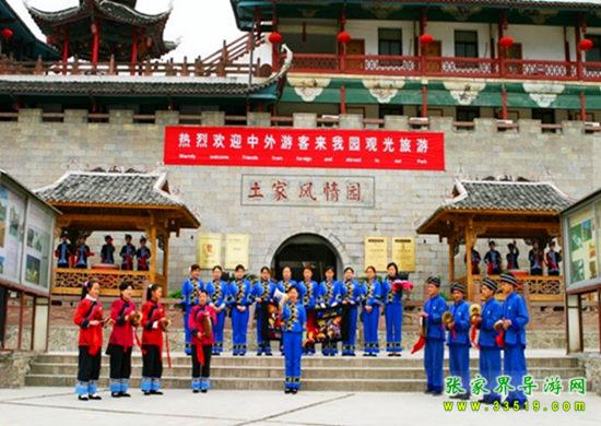 土家風(fēng)情園座落在張家界市內(nèi),占地5公頃多,是一座人文景 觀與自然景觀相融合,集旅游觀光、文藝表演、奇珍展覽、住宿、娛樂、購物等于一體的大型綜合性旅游服務(wù)企業(yè)。其主要由土家建筑群落、民風(fēng)民俗展示、文藝表演、客房、餐飲、大型狩獵場(chǎng)、珍稀植物園、根雕基地等功能區(qū)構(gòu)成。園內(nèi)建筑多為木石結(jié)構(gòu),雕梁畫棟,金碧徽煌、飛檐翹角 、玲瓏雅致。2001年4月,國務(wù)院總理朱镕基入園視察并給予很高的評(píng)價(jià)。2002年9月,由一千人參加表演的千人毛古斯舞蹈活動(dòng)在園內(nèi)舉辦并獲得圓滿成功,千人毛古斯和九重天吊腳樓同時(shí)被列入世界吉利斯記錄。2004年1月,土家風(fēng)情園被評(píng)為國家4A級(jí)旅游區(qū)(點(diǎn))。