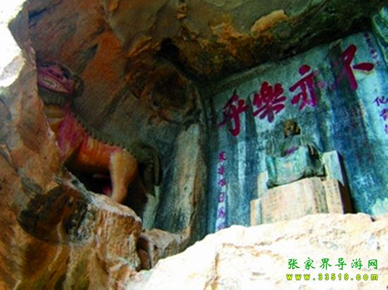 玉皇洞石窟位于張家界城西約7公里的麻空山南壁,為清代本地鄉(xiāng)紳李京開(kāi)獨(dú)資捐修。李京開(kāi)又叫李五瑞,別名九洞樂(lè),號(hào)識(shí)破生。他生于乾隆七年(公元1742年),道光乙酉年(1825年)去世,享年83歲。李先生家道殷實(shí),富甲一方。少時(shí)勤奮讀書(shū),頗有才華,數(shù)十年奔波仕途,但屢試不第,官場(chǎng)無(wú)望,于是看破紅塵,另尋安慰,請(qǐng)工匠,耗巨資,憑借麻空山天然溶洞,按上、中、下方位布局,巧妙構(gòu)思,開(kāi)鑿成“天堂”、“人間”、“地府”三層共八個(gè)洞。另外,在離此約3公里的峰泉洞另鑿一洞,故有“九洞樂(lè)”別名。玉皇洞石窟上層為玉皇洞,人間層有玉金洞、毫筆洞、墨池洞、虎龍洞、雄獅洞、孔圣洞,地府為因果洞,八洞組成一個(gè)完整的混沌世界。居八洞之首的玉皇洞,雕有玉皇大帝神像,意為“天堂”至尊,統(tǒng)帥中層的“人間”和下層的“地府”,故八洞統(tǒng)稱玉皇洞。此洞于1799年動(dòng)工,到1807年完成,歷時(shí)八年。洞內(nèi)雕鑿了一些歷史人物的神像以及大量詩(shī)詞匾對(duì),不僅石雕精湛獨(dú)特,雕像神韻生動(dòng),書(shū)法遒勁大氣,而且在石窟藝術(shù)的主題構(gòu)思上,抒發(fā)了主持捐修者李京開(kāi)懷才不遇、憤世疾俗、向往太平盛世的情感,鞭達(dá)了腐朽的科舉制度,對(duì)于研究清代社會(huì)和科舉制度,以及當(dāng)時(shí)一般讀書(shū)人的思想情感,都具有一定的史料價(jià)值。整座洞窟東西長(zhǎng)300余米,現(xiàn)存石像19尊,石刻50多處,是湖南省唯一保存完好的石窟藝術(shù)群,1959年玉皇洞被列入湖南省重點(diǎn)文物保護(hù)單位。