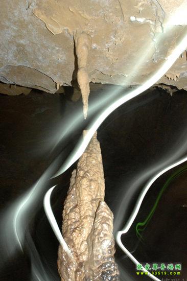 在這兒向您介紹一點(diǎn)溶洞學(xué)的知識(shí)。在溶洞中,自洞頂往下生長(zhǎng)的叫石鐘乳,自洞底往上生長(zhǎng)的叫石筍,兩者相向生長(zhǎng)連在一起就叫石柱,三者統(tǒng)稱為鐘乳石。這兒有一根石鐘乳與一根石筍是相對(duì)生長(zhǎng)的,差一點(diǎn)點(diǎn)就要連起來(lái)了,但他們卻永遠(yuǎn)不能合在一起,因?yàn)樯厦娴氖娙橐呀?jīng)沒(méi)有滴水,已經(jīng)失去了生命力。這好像一對(duì)苦苦守望的情人,近在咫尺,卻永遠(yuǎn)不能相逢。于是人們便給他們?nèi)×艘粋€(gè)非常動(dòng)人的名字——恨難逢。“盈盈一水間,脈脈不得語(yǔ)。”“天涯海角有窮時(shí),只有相思無(wú)盡處。”在無(wú)數(shù)個(gè)春去秋來(lái)的日子里,他們?cè)撚卸嗌匐x愁別緒??!——真不知道是石頭多情,還是人多情?——而有的人說(shuō)得很樂(lè)觀,“兩情若是長(zhǎng)久時(shí),又豈在朝朝暮暮”,所謂“距離產(chǎn)生美”嘛。