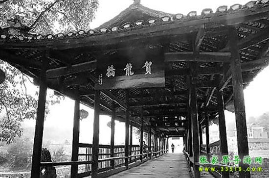 賀龍橋原稱“永安橋”。飛架于賀龍故居右側(cè)玉泉河上,是一座石墩、木粱、騎廊的風(fēng)花橋。東西長40米、寬7米、高8米。龍爪翹檐,中聳堡亭,8尊石獅,分置橋頭及石墩之上,造型渾厚古樸,富有民族特色。此橋原是溝通桑植內(nèi)外半縣的必經(jīng)之道,是上川鄂下津澧的要津,也是當(dāng)年鹽局奪槍、桑植起義的發(fā)端處。系賀龍?jiān)娓纲R廷宰首倡捐資修建,幾番修而復(fù)圮。至1916年,終由賀龍父親賀仕道襄修告竣。1929年冬,桑植“剿共”司令陳策勛,謂以破“賀氏風(fēng)水”,令毀此橋。解放后,桑植縣人民政府于1952年冬按原樣復(fù)修,命名“賀龍橋”。“文化大革命”動(dòng)亂中,林彪、“四人幫”誣陷賀龍,指使“紅衛(wèi)兵”毀橋,群眾奮起護(hù)衛(wèi),才幸免劫難。1983年5月,賀帥女兒賀曉明應(yīng)縣政府請求,得全國書法家協(xié)會秘書長謝德萍書匾“賀龍橋”,高懸橋之東西首,永志紀(jì)念。1978年,賀龍故居及其生平業(yè)績陳列室、賀龍橋,列為省級重點(diǎn)文物保護(hù)單位。凡到賀龍故居、賀龍紀(jì)念館的游客這是必經(jīng)之地。