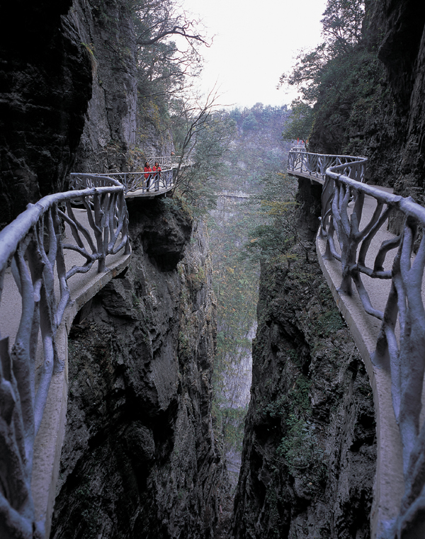 站在棧道上俯瞰群山,古人“會當(dāng)凌絕頂,一覽眾山小”的感覺油然而生。由于天門山國家森林公園,植被特別豐富,加上典型的喀斯特地貌,所以,在這條棧道上更能找到一種在乘坐直升飛機(jī)飛越熱帶雨林大峽谷的感覺,這平時只能在電影里看到的場景,在這里能讓你身臨其境。
