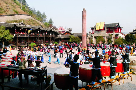 三棒鼓,唐代稱三仗鼓,明沈行符《顧曲雜言》 曰:“吳下何來(lái)有打三棒鼓乞錢者,余幼時(shí)有見(jiàn)之也, 起于唐咸通中(公元865年)”約于明代傳入本境, 并逐漸成為群眾增聞樂(lè)見(jiàn)的民間藝術(shù)形式。每年春節(jié) ,藝人們結(jié)伴走村竄寨拜年,表演對(duì)象不分貧富,戶 戶必到。如遇貧寒之家,表演者將別家贈(zèng)送禮品相送 ,意在人人過(guò)節(jié)歡喜。充分體現(xiàn)出土家族人熱情好客 ,心地善良的民族性格,對(duì)加強(qiáng)民族團(tuán)結(jié)有一定作用 。 三棒鼓通常由三至五人組成,一人擊鼓唱詞,一 人鑼鈸配樂(lè),一人?;ò簟;ò羧?,長(zhǎng)一尺,舞者 左右手各持一根,將另一根拋在空中,左右開(kāi)弓,擊 打空中花棒使之不落地。也有以刀代棒,以五刀代三 棒的技藝。技藝高強(qiáng)者,突然把刀拋得極高,來(lái)一個(gè) 眼花繚亂,不禁稱絕。打三棒鼓,通常有“鬧春耕” 、“收割打場(chǎng)”、“慶豐收”、“拜年節(jié)”四套,分 “鯉魚(yú)跳龍門”、“玉女穿梭”、“板巖漂灘”等項(xiàng) 目。打三棒鼓技巧性強(qiáng),表演時(shí)需高度集中,用力適 當(dāng),貫通一氣,并與演唱者默默配合。