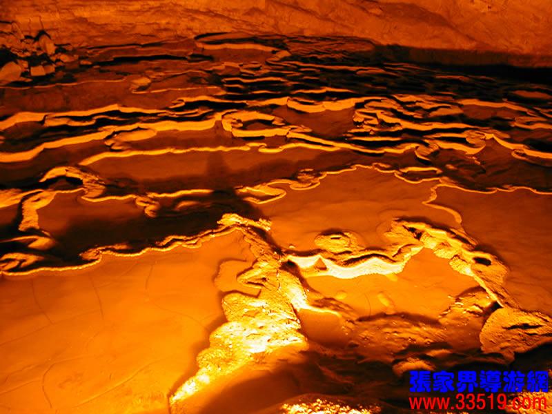 (龍宮)龍宮是黃龍洞十三個大廳中最大的一個,也是景色最美的景點之一,底面積15000平方米,平均高40米,兩千余根石筍拔地而起,千姿百態(tài),異彩紛呈,或如飛禽走獸,或如宮廷珍藏,有的像巍巍雪松,有的像火箭升空。龍宮后園有金銀兩座花池,清水常溢,花簇盛開。宮頂鐘乳柳垂簾掛,四周壁畫栩栩如生。溶解著各色各樣的礦物質(zhì)的水,從巖層中滲透出來,滴落下來。礦物質(zhì)在洞頂凝固結(jié)晶成倒懸鐘乳石,從鐘乳石滴落的水又把礦物質(zhì)澆疊、堆壘在洞底,而長成節(jié)節(jié)向上的石筍。大家看看這龍宮的造型,領略這磅礴的氣勢。洞內(nèi)最大石筍,高12米、直徑10米的漢白玉天然石椅“龍王寶座”居高臨下,眾多石柱石筍似人似物,維妙維肖,圍著寶座朝拜山呼,幾十座珊瑚亭亭玉立,儼然一支龐大的“宮廷樂隊”。湖南著名教授羊春秋先生作《寄生草》詞對此進行描繪:“百態(tài)千姿模樣,三宮六院門巷。龍王開宴設瓊漿,猴王偷果鬧天堂,君王納寵擁羅帳。搬演了人間爭攘,匯集了天下奇觀。”