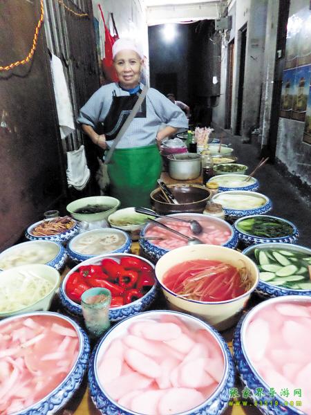 鳳凰本地人介紹好吃的,總是推薦姜糖、獼猴桃等,事實(shí)上,當(dāng)?shù)匦∠锷钐幍呐莶送瑯恿畈簧儆慰唾澆唤^口。酸酸的泡菜可以是豆角,也可以是當(dāng)?shù)靥赜?的紅心蘿卜、刀豆、包菜、涼薯等,這些都可以成為泡菜原料,每種原料用陶缽盛著擺在架子上。想吃什么,自己用筷子夾了放一起。過完秤,可以根據(jù)自己的喜好 放辣椒粉或白糖拌(辣椒粉還分微辣、猛辣),往旁邊小桌上坐下,邊吃邊看著古街上那些匆匆而過的游客,那種感受絕不亞于在國外街頭喝咖啡賞景。