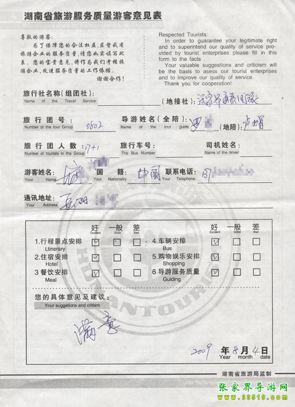 2009年8月2日岳陽龍先生一行18人接待質(zhì)量反饋單: